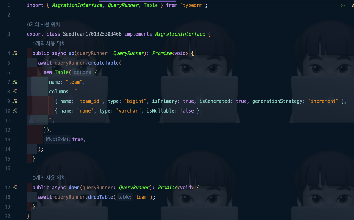 up()์ queryRunner.createTable()์ ํ์ฉํ์ฌ team์ด๋ผ๋ ํ