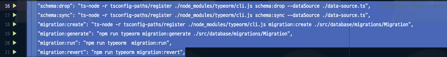 ๊ทธ๋ฆฌ๊ณ ์์ ๊ฐ์ด package.json script{}์ TypeORM migraion ๊ด๋ จ Script๋ฅผ ๋ฃ์ด์ฃผ์์ด์.