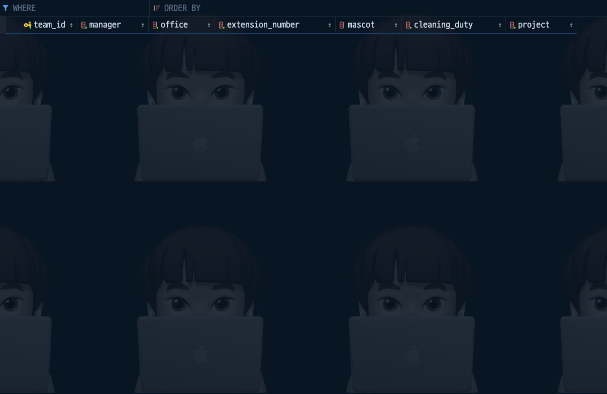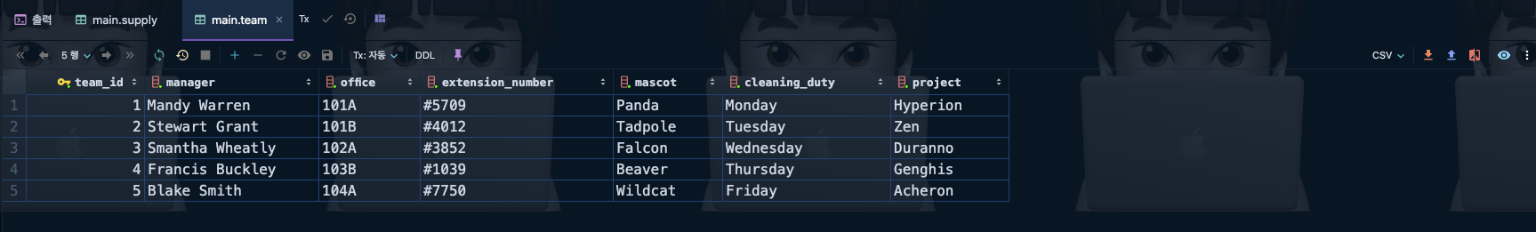 query: CREATE TABLE "team" ("team_id" integer PRIMARY KEY AUTOINCREMENT NOT NULL, "manager" varchar NOT NULL, "office" varchar NOT NULL, "extension_number" varchar NOT NULL, "mascot" varchar NOT NULL, "cleaning_duty" varchar NOT NULL, "project" varchar NOT NULL)