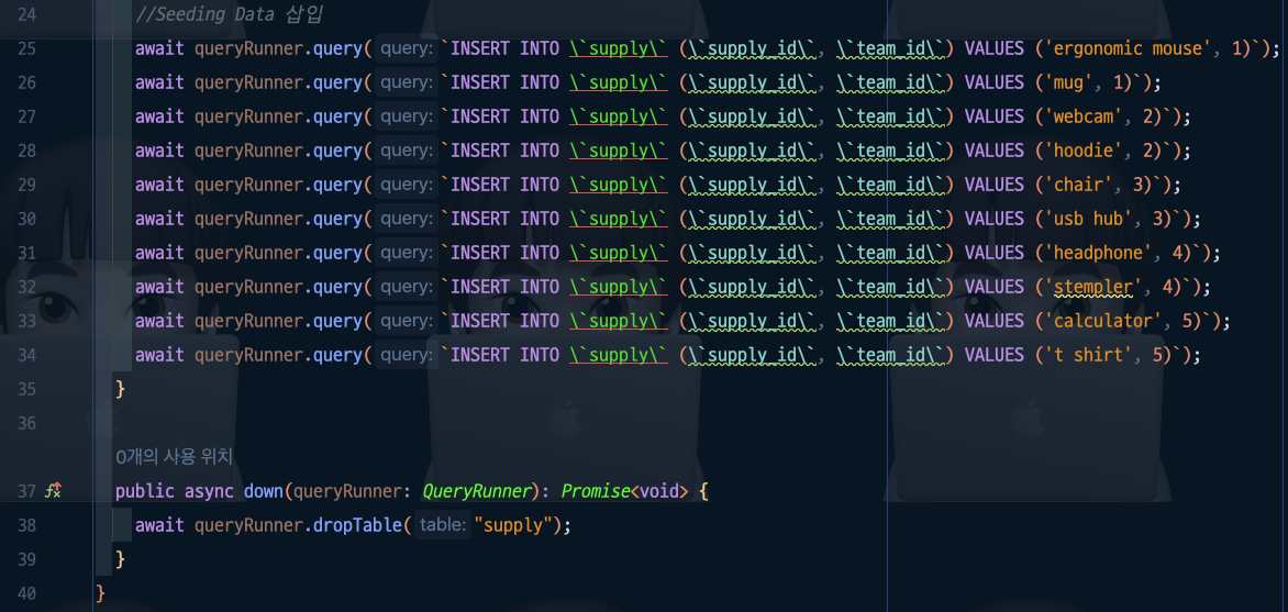 await queryRunner.query(`INSERT INTO "temporary_supply"("supply_id", "teamTeamId") SELECT "supply_id", "teamTeamId" FROM "supply"`);