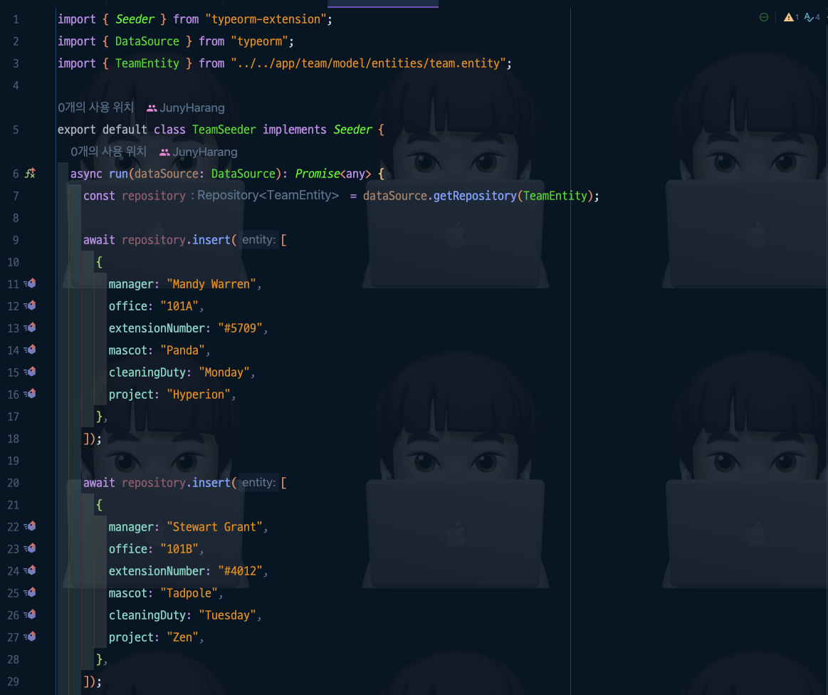 Seeder๋ฅผ ๋ณด๋ฉด Team Table์ ๊ฐ์ด ๋ค์ด๊ฐ๊ณ ๋์ ํด๋น Table์ teamId๋ก ํ ๊ฐ์ฒด๋ฅผ ๊ฐ์ ธ์