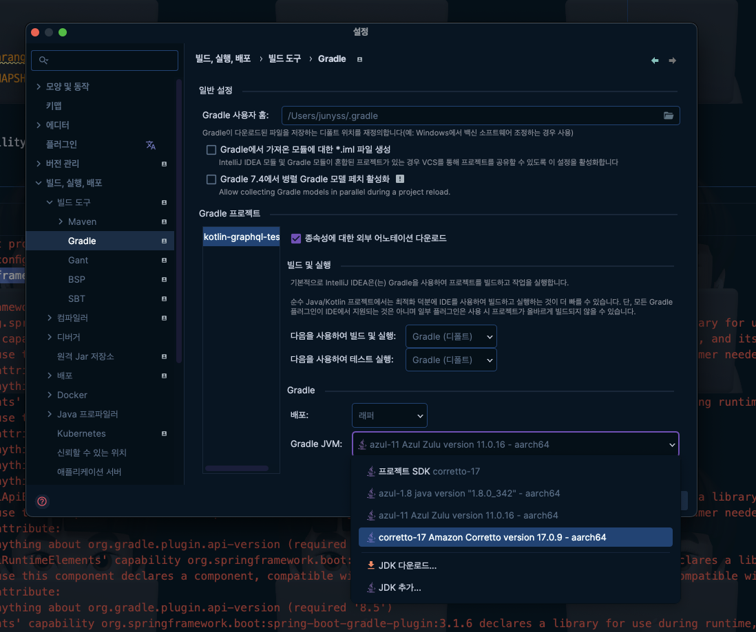 ์์ ๊ฐ์ด InteliJ์ Gradle JVM ๋ฒ์ ์ด 11.0.16์ผ๋ก ์ค์ ๋์ด ์๋ ๊ฑธ ์ ์ ์์ด์.