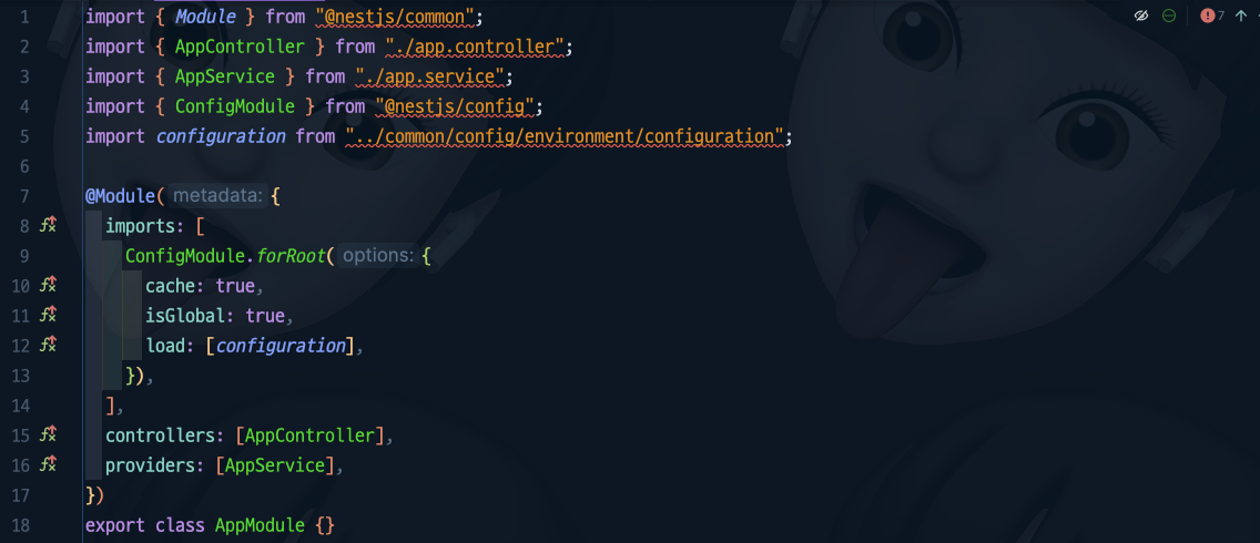 1๋ฒ์งธ ์ค์ @nestjs/config ๋ชจ๋์ Import(์ํฌํธ) ํด ์ฃผ๊ณ , ์ด๋ฅผ ํตํด ์ค์ ๊ด๋ฆฌ๋ฅผ ํ ์ ์๋๋ก ํด ์ฃผ์์ด์.