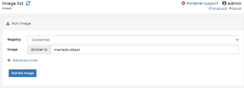 [ Images ] Tab에 들어와서 위와 같이 Image 란에 [ mariadb:latest ] 라고 입력 해 준 뒤 [ Pull the Image ]를 눌러 Download 하도록 하겠습니다.