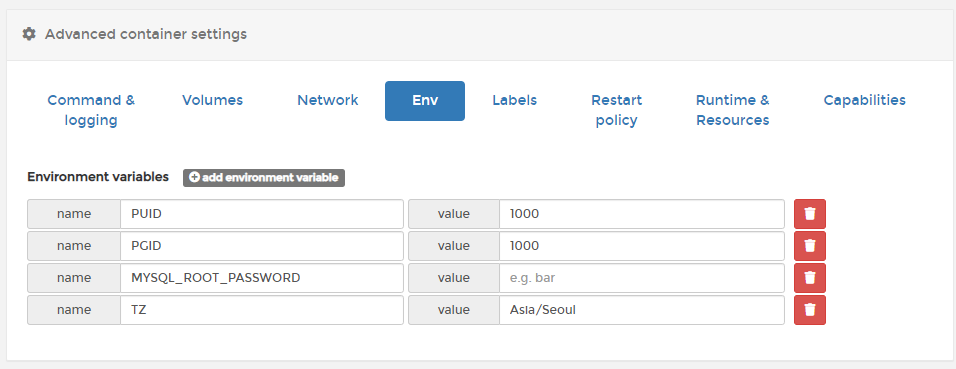 [ Advanced container setting ]에서 [ Env ] Tab을 선택한 뒤 Process ID, Process Group ID 그리고, MariaDB의 admin 권한을 가진 계정의 비밀번호와 TimeZone을 위와 같이 입력 해 주세요!