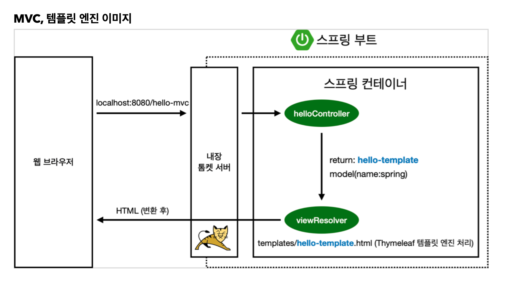 return๊ฐ์ด 'hello-template"์ผ๋ก ๋์ด ์๊ธฐ ๋๋ฌธ์ templates ๋ฐ์ hello-template.html์ด ์๋์ง ์ฐพ์ ๋ณด๊ฒ ๋๋ ๊ฒ์ด๊ณ , model.addAttribute๋ฅผ ํตํด Key์ value๋ฅผ ์ ๋ฌ ๋ฐ๋๋ฐ, view์์๋ ์ด๊ฒ์ ์ฐธ์กฐํ๋ ๊ฒ์ผ๋ก ์ฒ๋ฆฌ ๋์๊ธฐ ๋๋ฌธ์ uri์ ํ๋ผ๋ฏธํฐ ๊ฐ์ ๋ฐ์์ ์๋ต์ผ๋ก ์ฒ๋ฆฌ ํด ์ฃผ๋ ๊ฒ์ด์์.