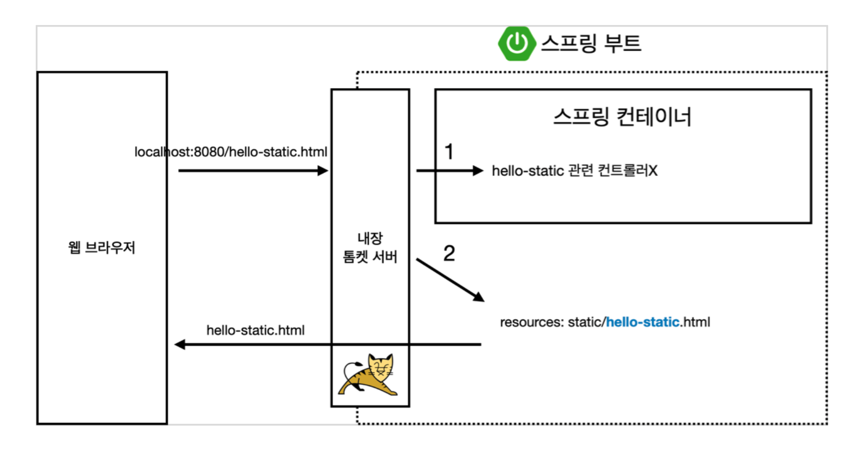 ์์ ๊ฐ์ด ๋์ํ๋ ์๋ฆฌ๋ ๋จผ์ Web Browser๊ฐ uri์ hello-static.html์ ๋ณด๋ด๊ฒ ๋๋ฉด ํฐ์ผ ์๋ฒ๊ฐ ๋จผ์ ๊ทธ ๋ด์ฉ์ ๋ฐ์ ๋ค Spring Boot์๊ฒ ์ ๋ฌ ํด ์ฃผ๋ ๊ฒ์ด์์.