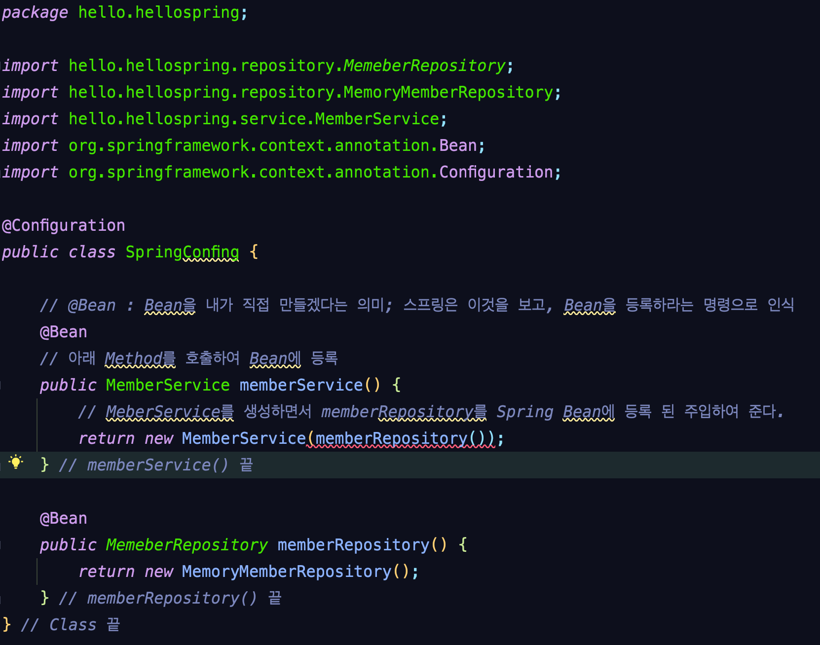๋จผ์ ์ฃผ๋ํ๋์ main / java / hello / hellospring / SpringConfig.java ๋ผ๋ Class๋ฅผ ๋ง๋ค ๊ฒ์ด์์.